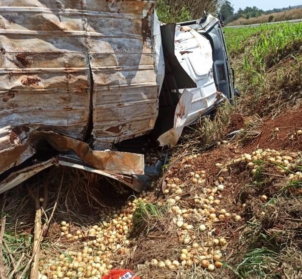 O veículo ficou danificado e a carga de cebolas e batatas ficou espalhada. Apesar dos danos, não há informações sobre feridos.