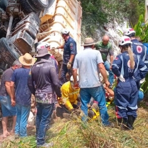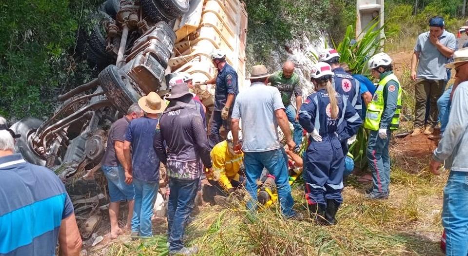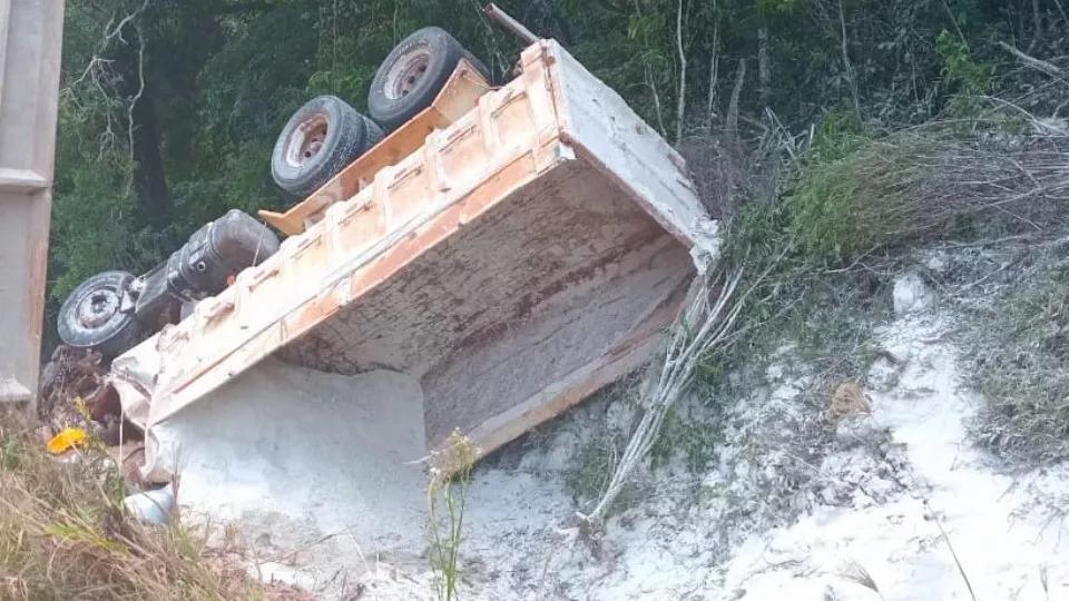 No veículo estavam duas pessoas, um homem de 23 anos, e o condutor com idade entre 55 e 65 anos, momento em que um determinado ponto de uma descida, ocorreu o acidente. O caminhão passou reto em uma curva, subindo no barranco e tombando logo em seguida.