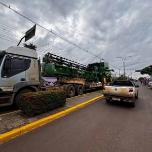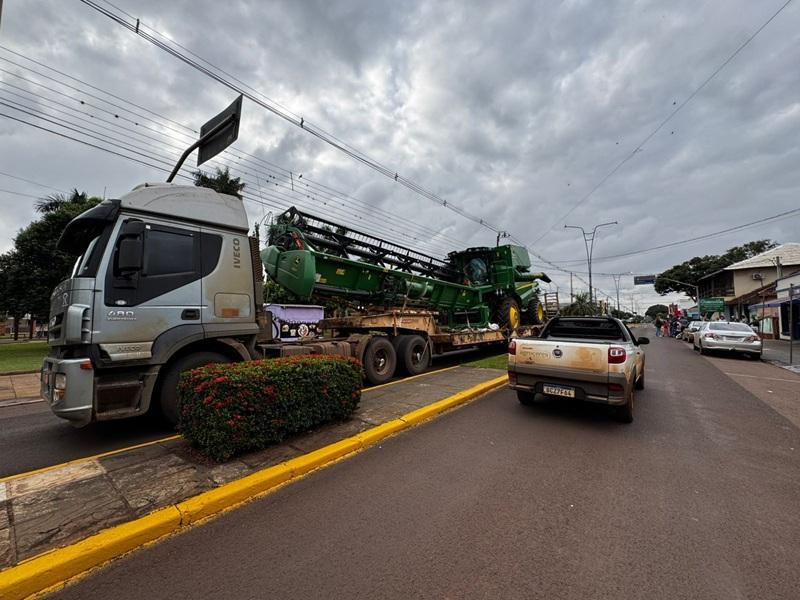 O centro de Nova Santa Rosa voltou a ser cenário de transtornos causados por veículos de grande porte. Na tarde desta sexta-feira (6), um caminhão Iveco, com placas de Carazinho (RS), que transportava uma colheitadeira com destino a Santa Helena, passou pela Avenida Santo Cristo e acabou provocando diversos danos.