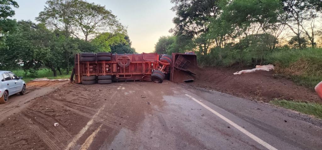 Caminhão carregado com esterco de aves tombou e interditou o quliômetro342 da PR 323 em Iporã, na manhã de terça-feira (4).