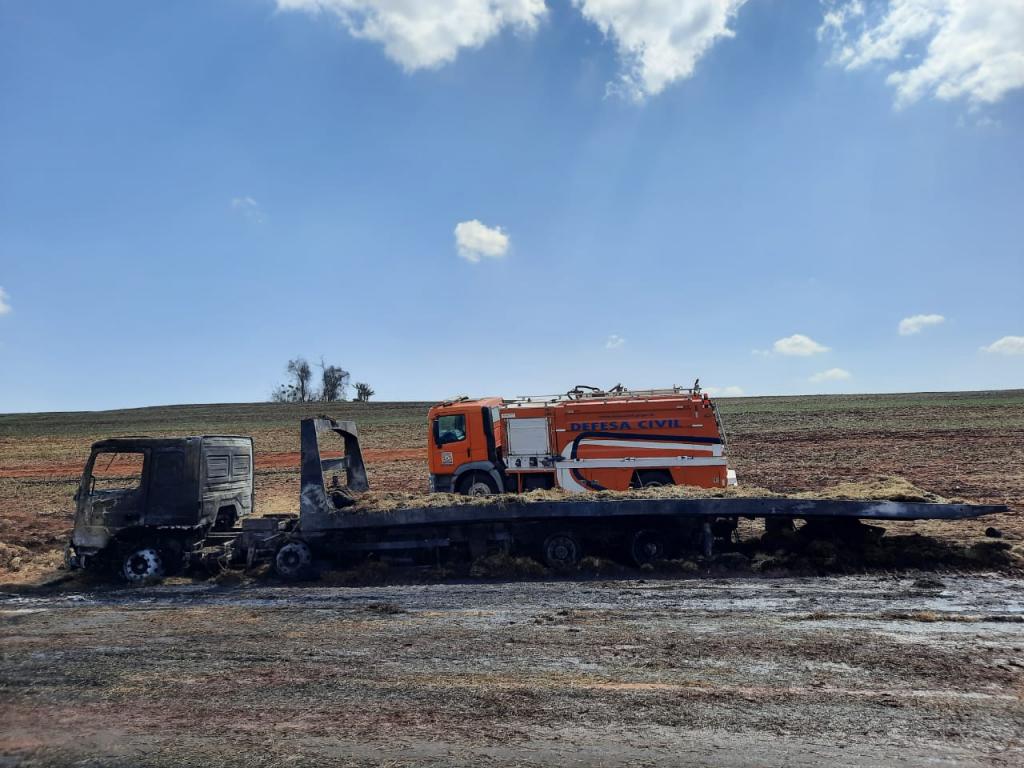 Uma equipe da Defesa Civil compareceu ao local para combater o incêndio que destruiu o caminhão e a carga.