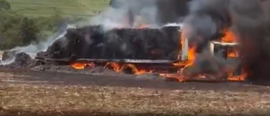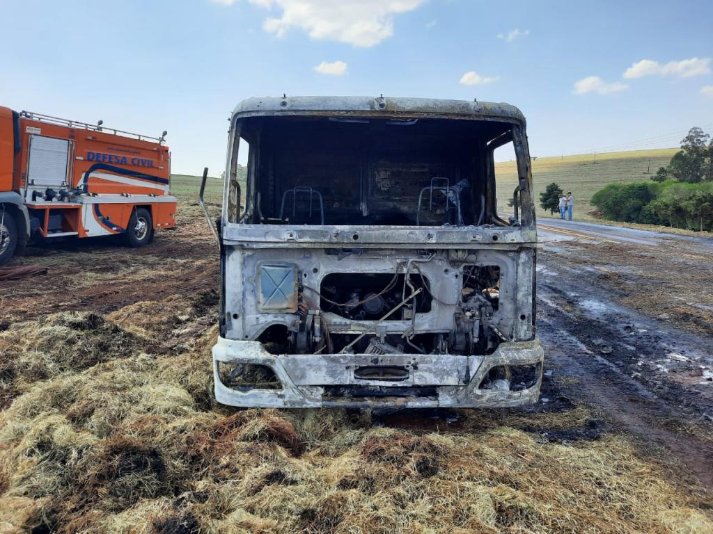 Um caminhão carregado com feno foi destruído por um incêndio, nesta tarde de sexta-feira (04), na PR 585, em São Pedro do Iguaçu, no trecho sentido a Vera Cruz do Oeste.