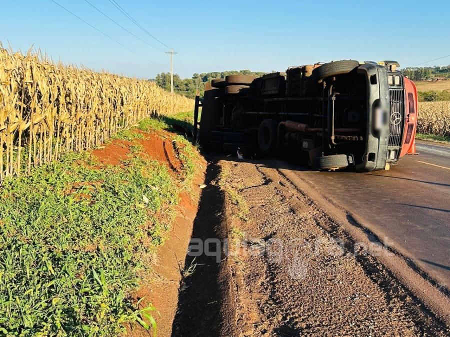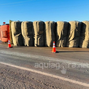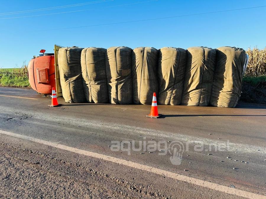 Um caminhão Mercedes-Benz carregado com feno tombou na noite de quinta-feira (13), na região da Curva do Rodeio, entrada da Linha Ouro Verde. Acidente aconteceu na PRc-467, no trecho entre a sede de Marechal Cândido Rondon e o distrito de Iguiporã.
