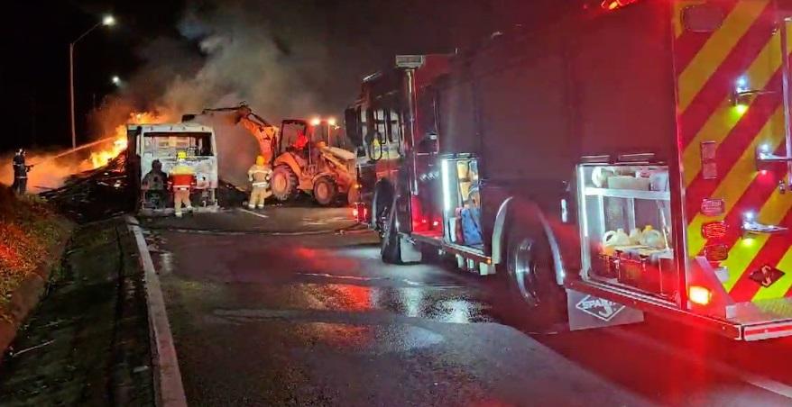Caminhão carregado com tábuas de madeira pegou fogo no quilômetro 672 da BR 376 próximo a Guaratuba, na noite de quarta-feira (23).