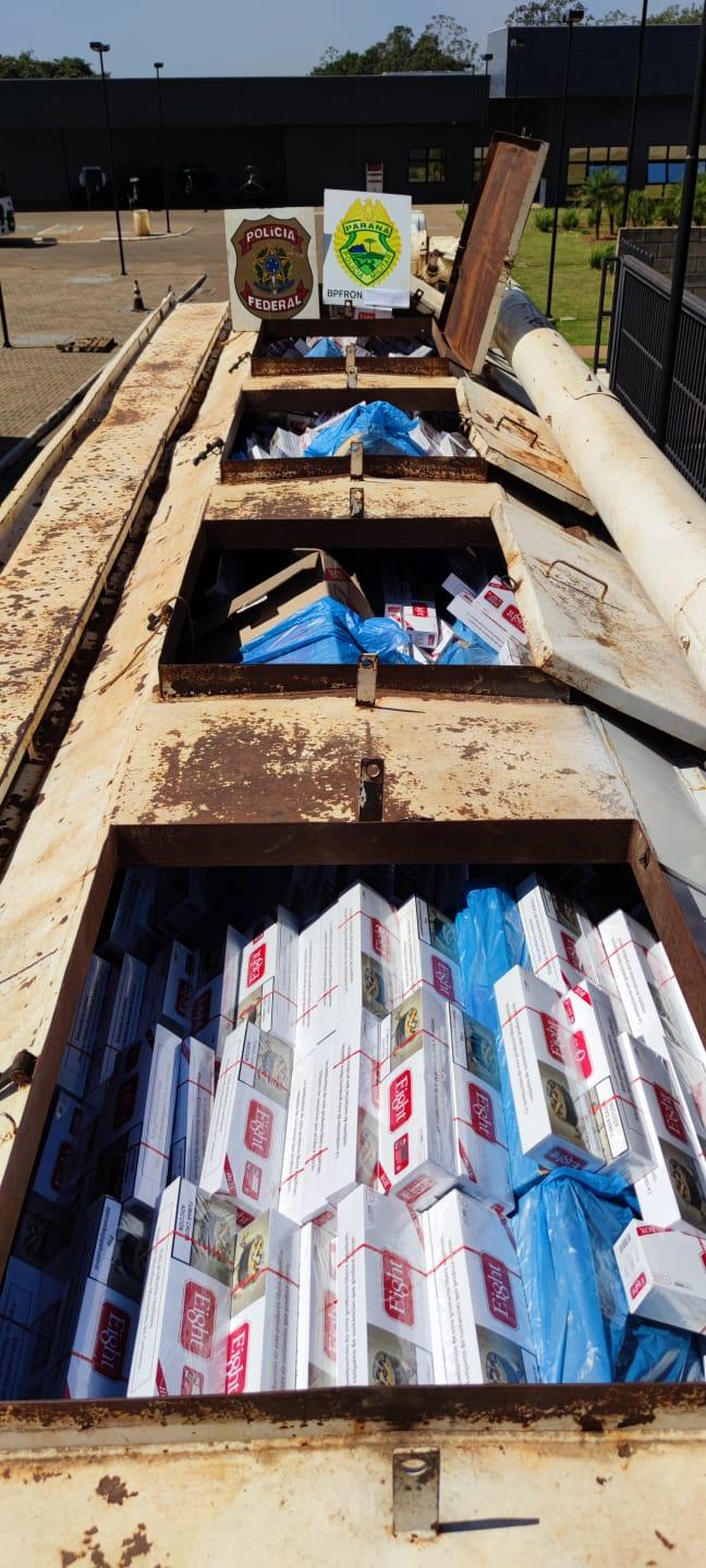 Dentro do compartimento de carga do caminhão foram localizados aproximadamente 500 caixas de cigarros. A apreensão, conforme a PF, gera um prejuízo de R$ 1,4 milhão ao crime organizado.