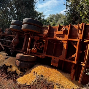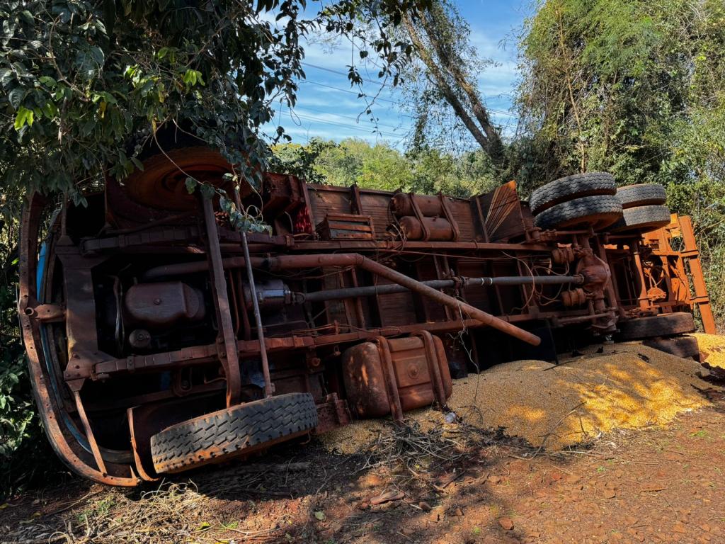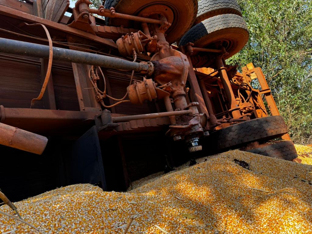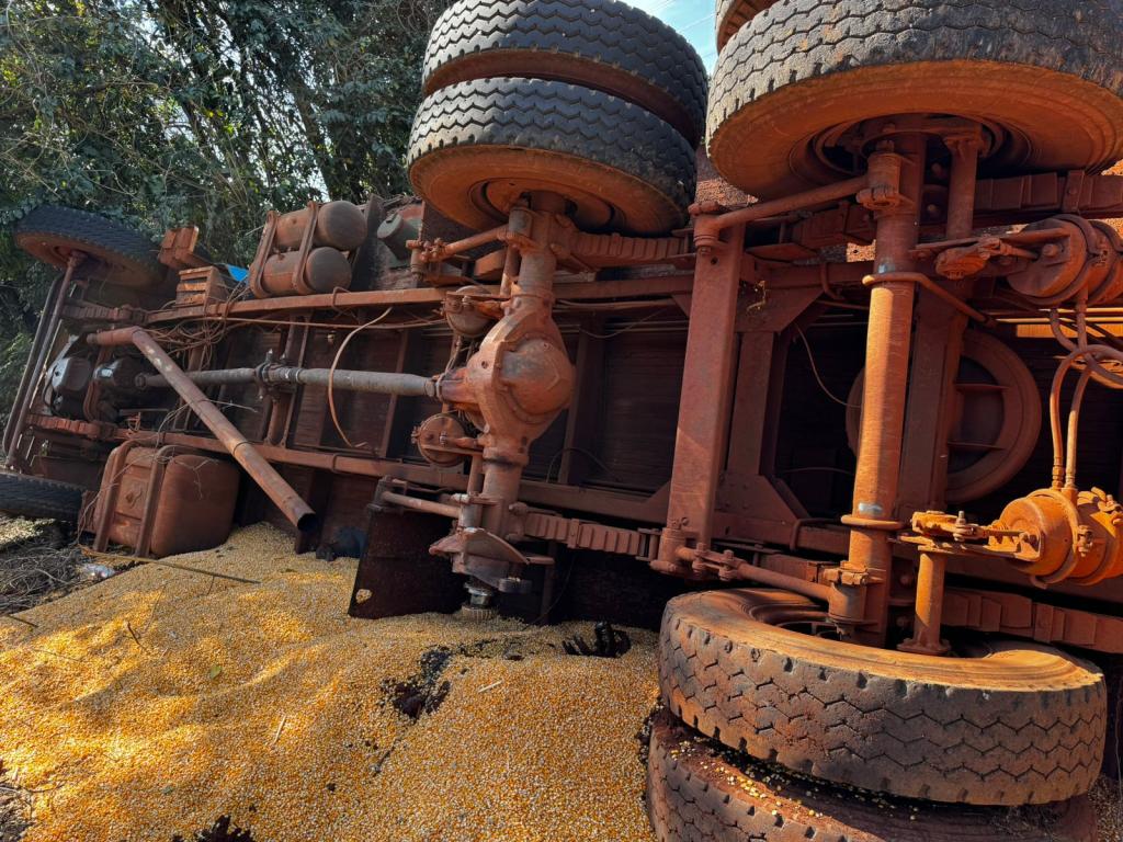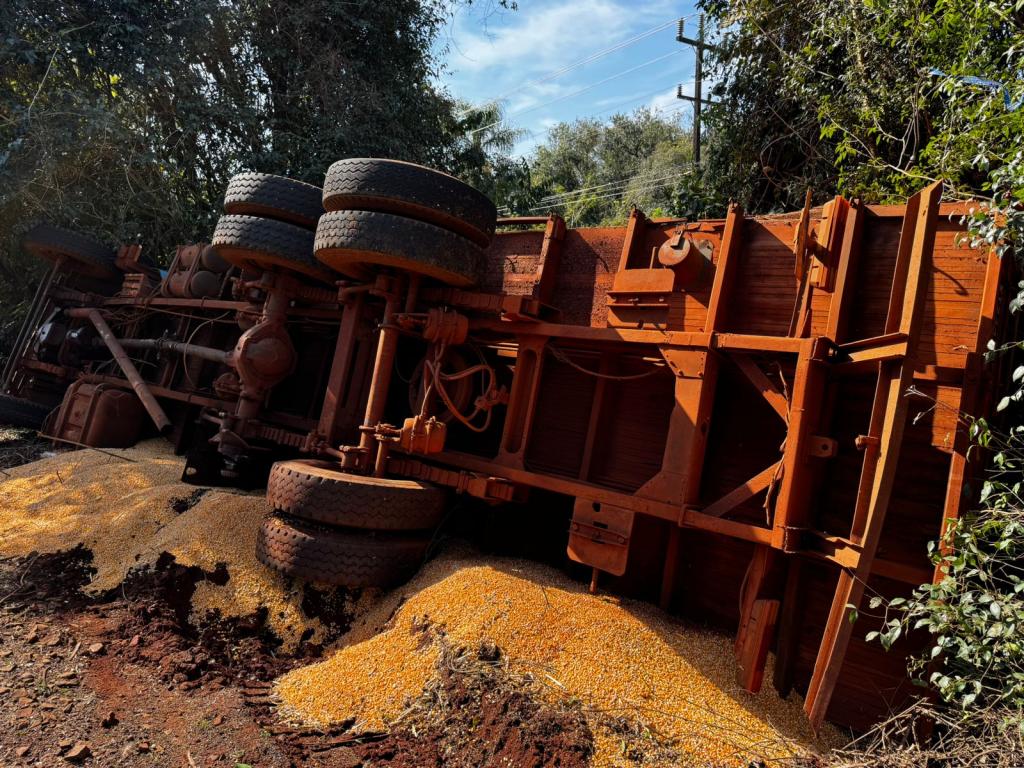 Um caminhão Mercedes Benz, carregado com aproximadamente 300 sacas de milho recém colhidas, tombou às margens da rodovia PR 589 entre Nova Santa Rosa e Novo Sarandi.