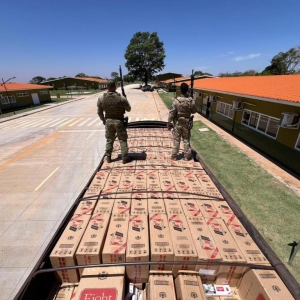 As equipes realizavam patrulhamento na área rural do município quando encontraram rastros de veículos saindo de uma região conhecida pela presença de portos clandestinos. Durante as buscas, foi localizado um caminhão Mercedes-Benz L/2014, abandonado sobre uma plantação de soja, carregado com o contrabando.