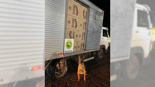 Nesta segunda-feira (19), no âmbito da Operação Protetor, policiais militares do pelotão de Operações com cães do BPFRON-Batalhão de Polícia de Fronteira, em ação integrada com policiais militares do 19°BPM, durante patrulhamento em Nova Santa Rosa, deram voz de abordagem a um caminhão que trafegava em alta velocidade.