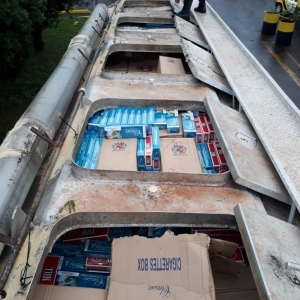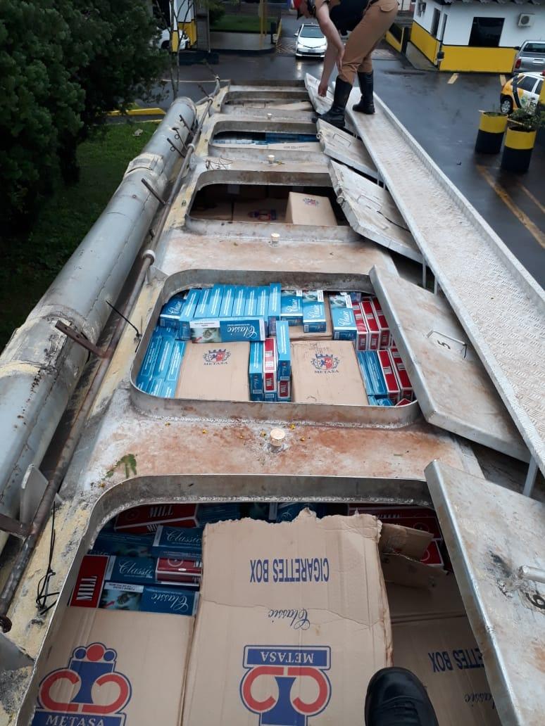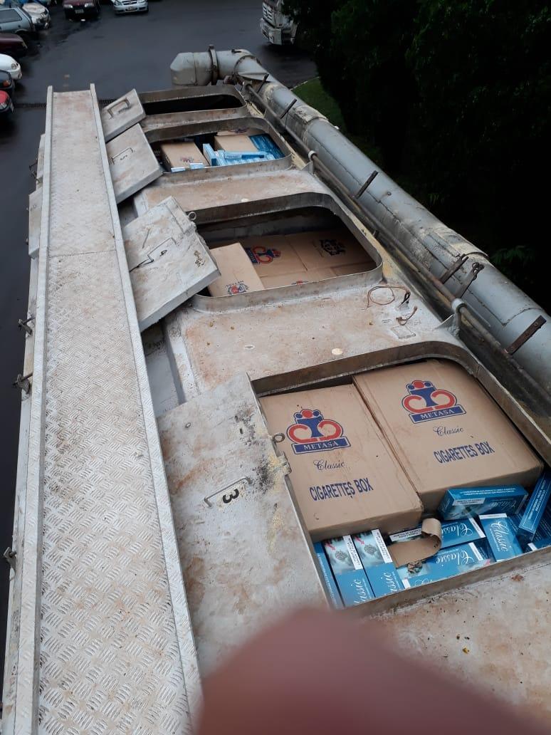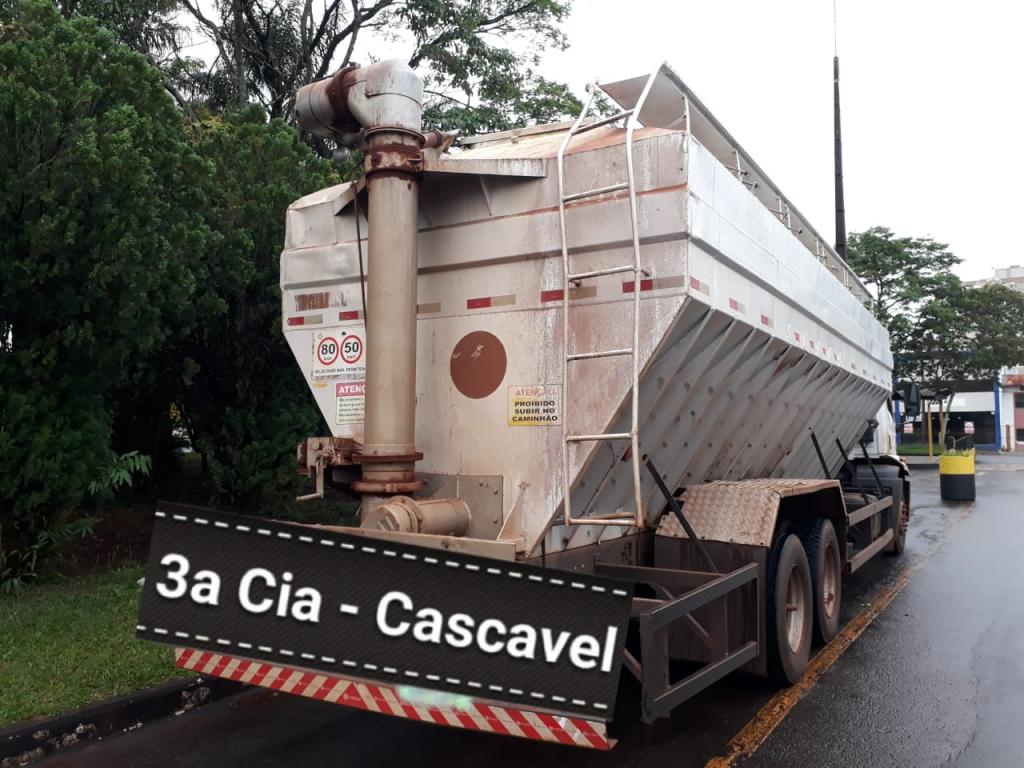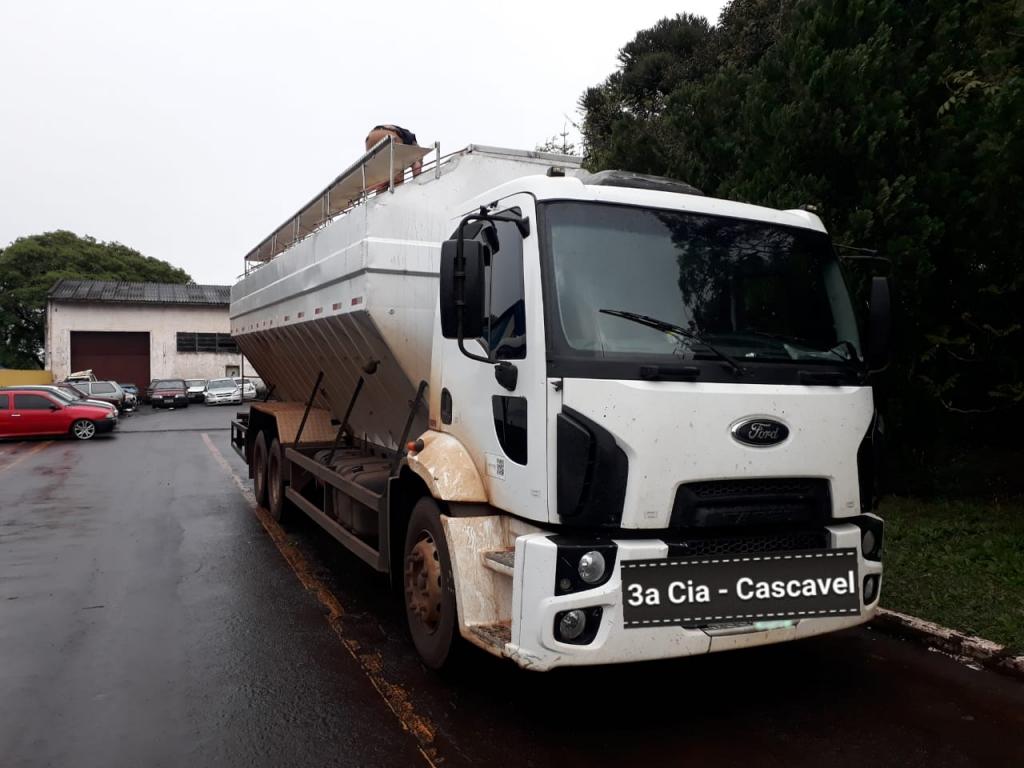 Após vistoria no veículo foi encontrado um carregamento de aproximadamente 350 caixas de cigarros de diversas marcas de origem estrangeira no interior do Silo, sendo identificado o Caminhão Ford / Cargo 3133, com placas de Toledo.