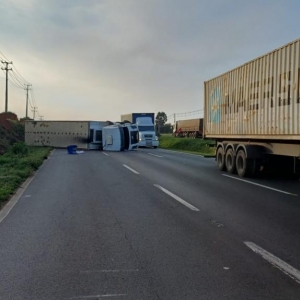 Durante o atendimento da ocorrência, o trânsito ficou parcialmente interditado para o transbordo da carga e a retirada do veículo. A situação foi registrada pelas autoridades competentes.