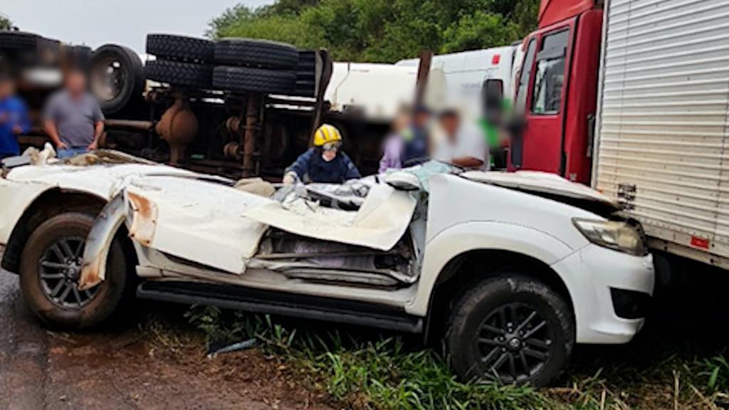 Um caminhão silo, carregado com ração, tombou em cima de um carro e matou uma mulher na BR 163, em Santa Lúcia, próximo de Capitão Leônidas Marques, no Oeste do Paraná.