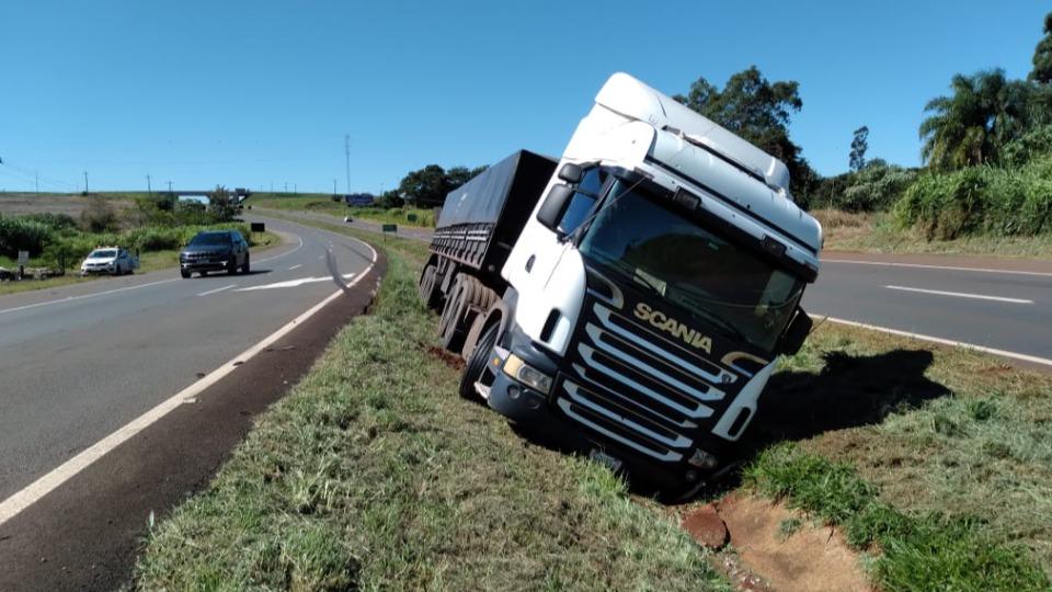 Um caminhão saiu da pista e foi parar no canteiro central da rodovia do km 602 da BR-277, em Cascavel (PR), na tarde desta quinta-feira (20).