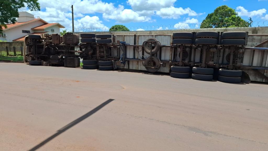 No final da manhã desta terça-feira 18, um caminhão que seguia pela rota utilizada por veículos de carga vindos de Toledo acabou tombando ao realizar a conversão para a Rua 1º de Maio, em Palotina.