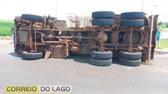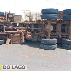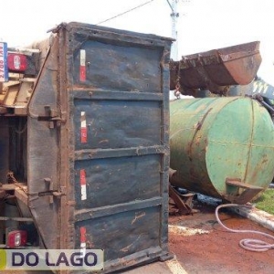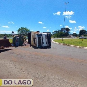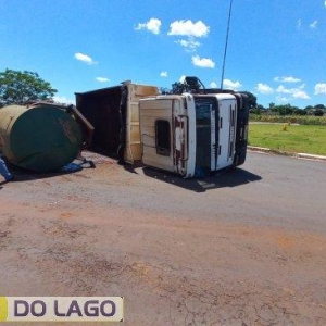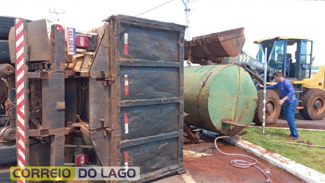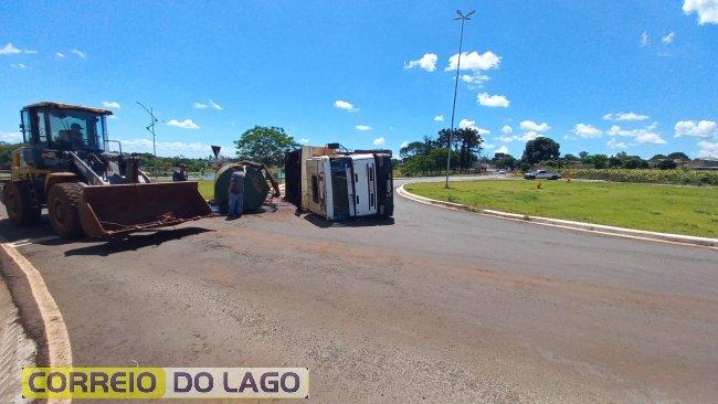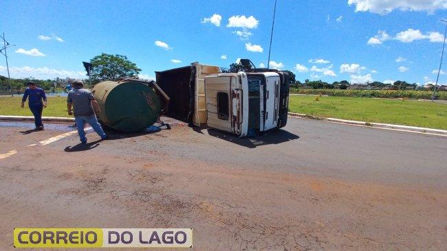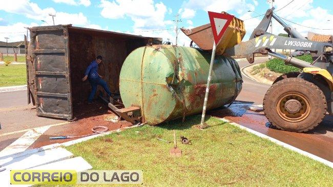 Um caminhão que transportava um tanque acabou tombando na rotatória, após o equipamento se desprender do veículo durante a manobra.