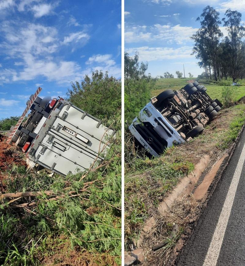 Um caminhão tombou ontem, segunda-feira (21), na PR-486, em trecho que liga o entroncamento da PR-323 (região de Cedro) ao entroncamento com a PR-681 (Alto Piquiri), no noroeste do Paraná.