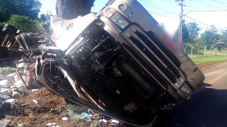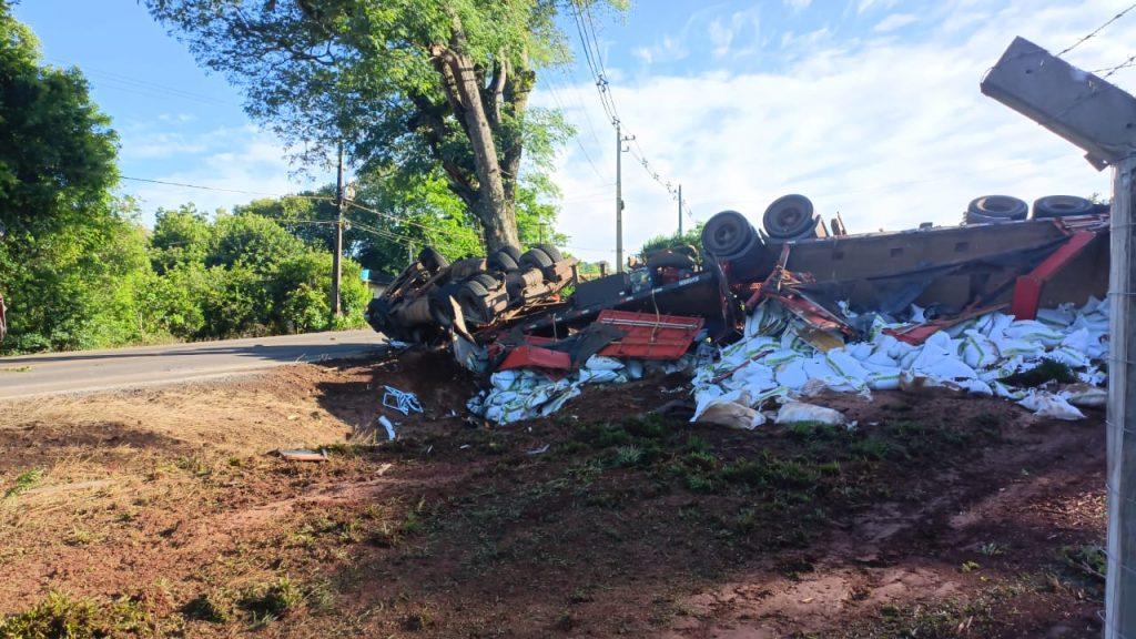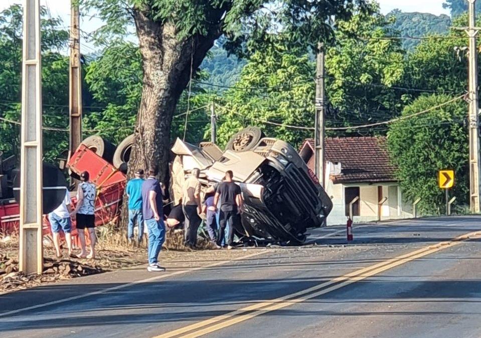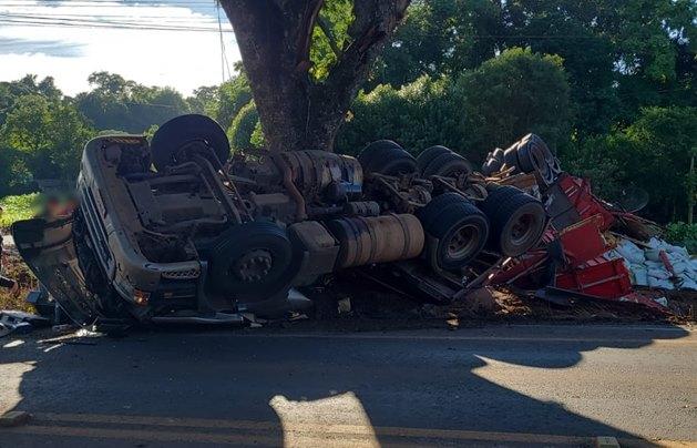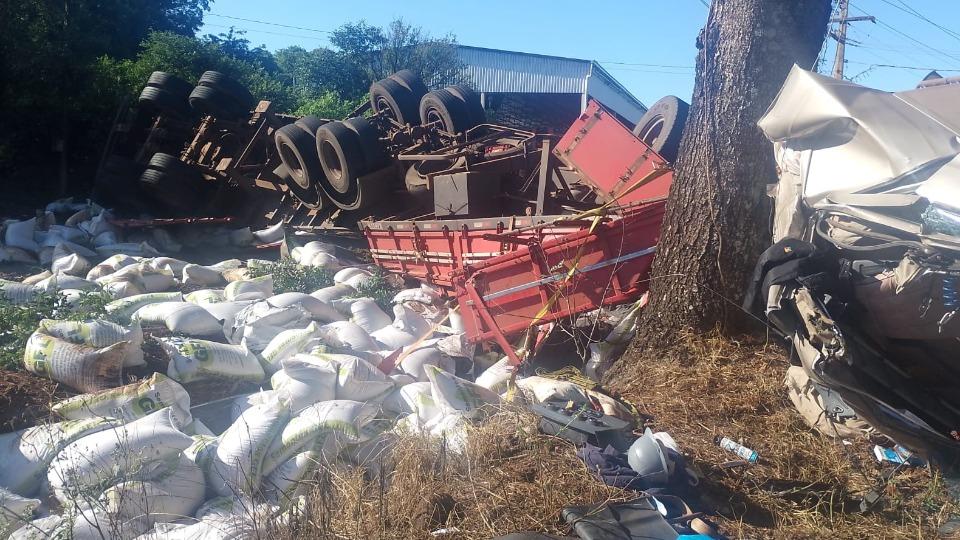 Conforme informações, um caminhão Scania, que tracionava um bitrem carregado com sacos de sementes, tombou e se chocou contra uma árvore.