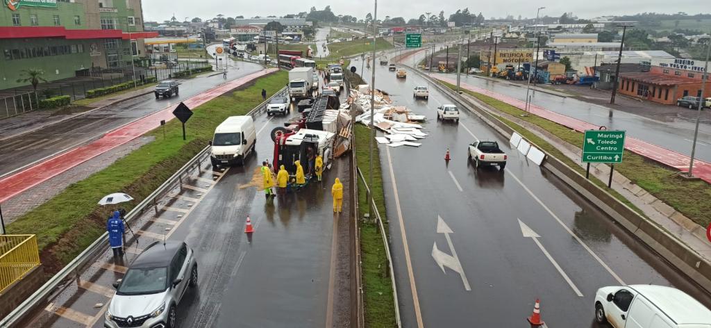 Na tarde desta sexta-feira (03) um tombamento de caminhão foi registrado no Trevo Cataratas na BR-277 em Cascavel.