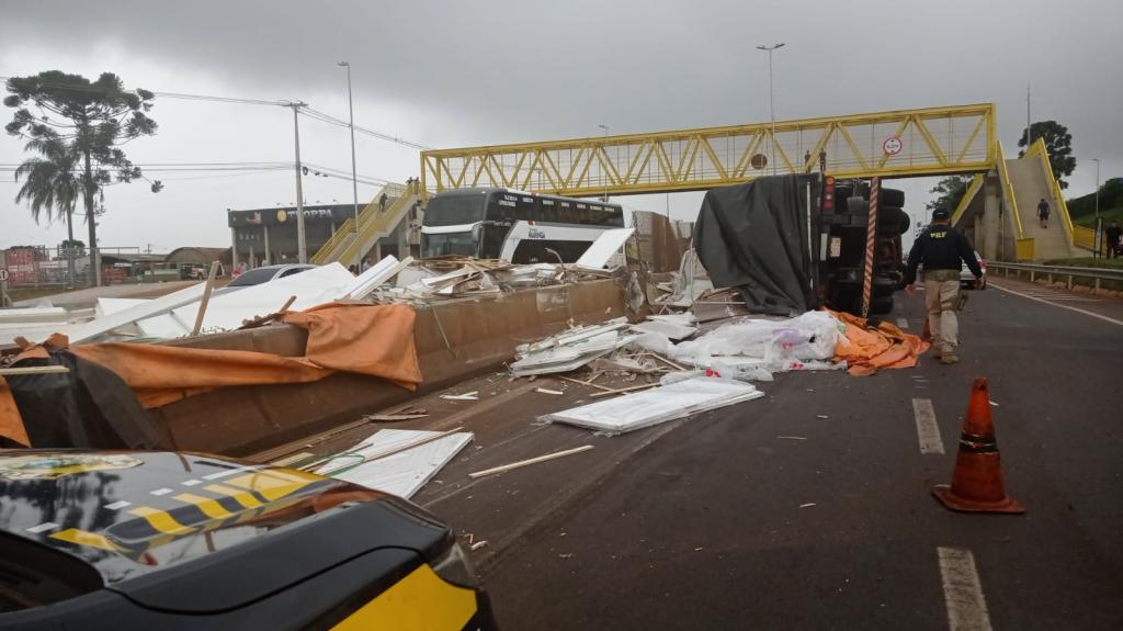 Ele levava uma carga de portas para a região da fronteira, que ficou espalhada pelo asfalto, causando alguns danos nos postes e nas muretas.