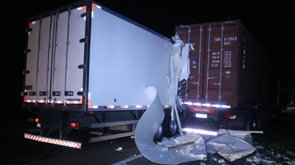 A colisão traseira, na região dos Pinheirinhos, envolveu um caminhão contêiner, carregado com tintas, e um baú refrigerado, com carga de carnes e frios, que seriam descarregados em um hipermercado do Município.