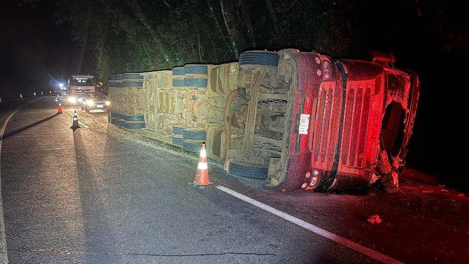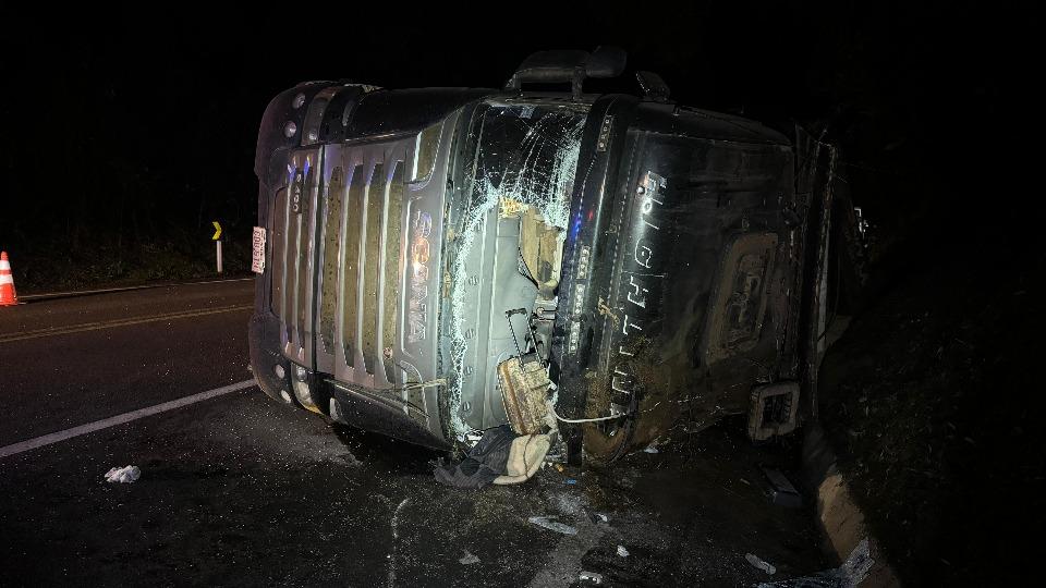 Um homem ficou ferido após tombar o caminhão que dirigia na BR 277, em Virmond, região Centro-Sul do Paraná, na noite da última terça-feira (16). O acidente deixou a carga de soja espalhada pela pista e causou alguns bloqueios na rodovia.