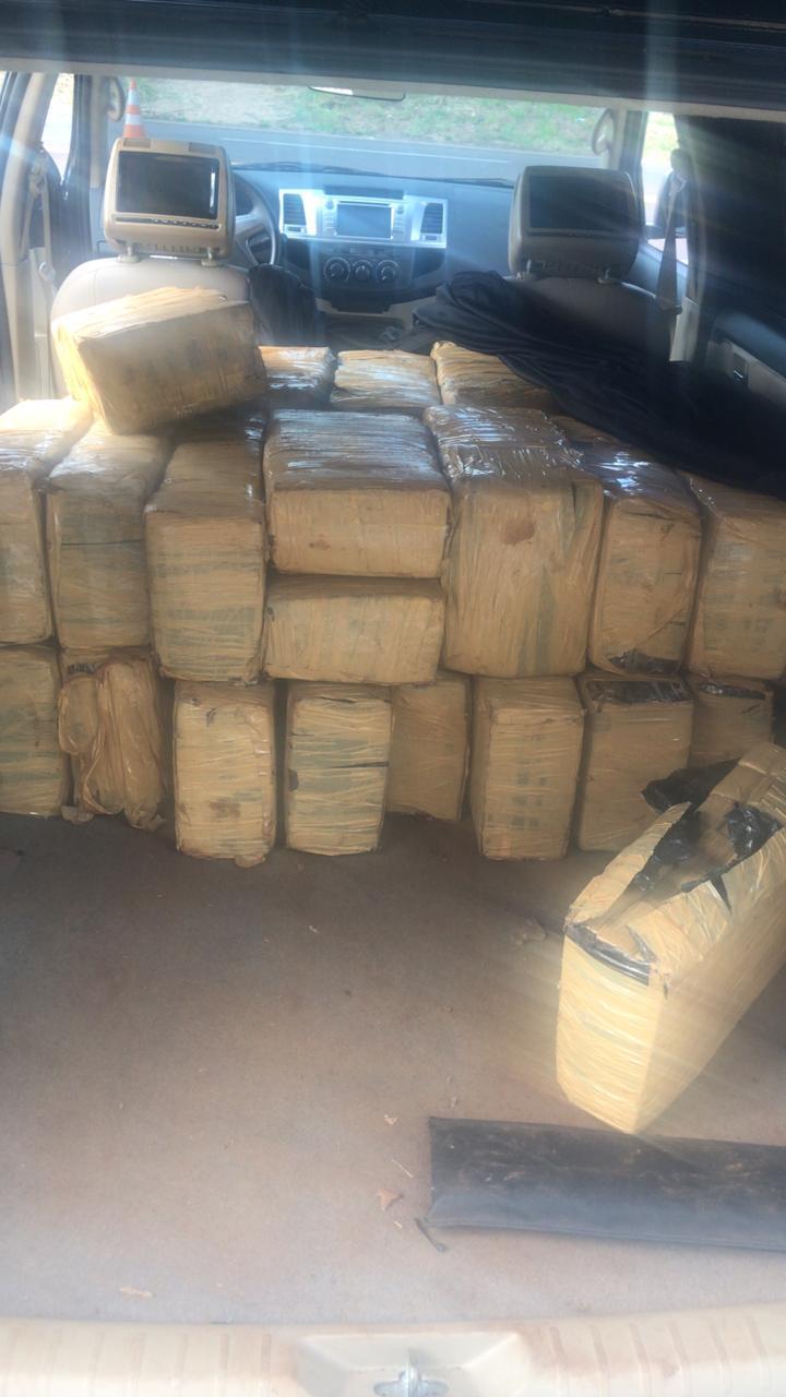 Durante a abordagem e vistoria à caminhonete Toyota/ Hilux SW4, foi constatado que a mesma estava carregada com vários fardos envoltos de fita adesiva, onde após conferência constatou ser maconha. Diante do flagrante, foi dada voz de prisão ao seu condutor 25 anos.