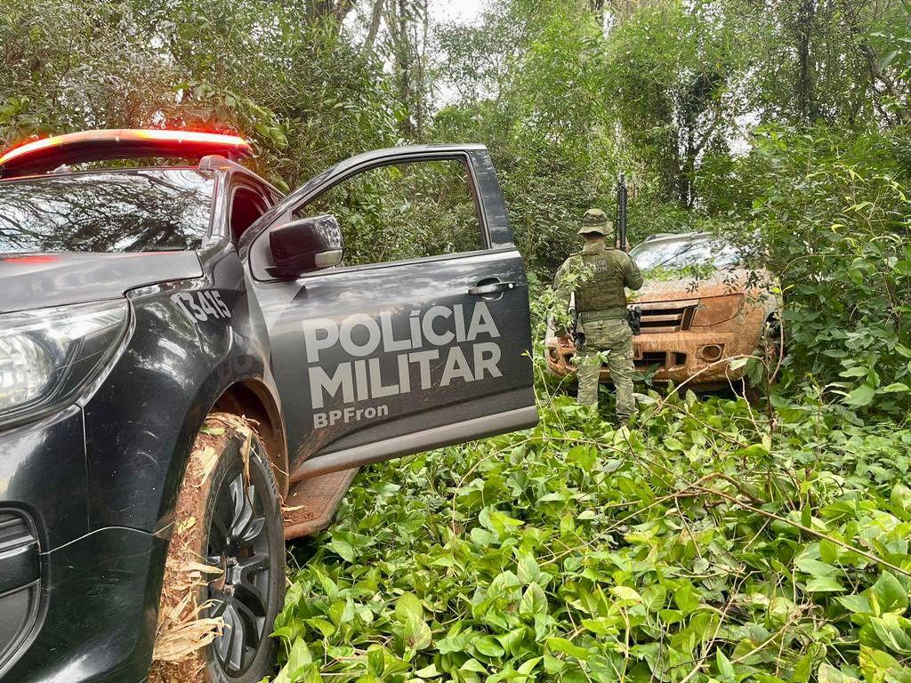 Durante o patrulhamento, a equipe do BPFRON avistou indícios de deslocamento em direção à vegetação nas proximidades, o que levou a uma investigação mais aprofundada. Ao se aproximarem do local, os agentes encontraram uma caminhonete Ford/Ranger branca, que estava discretamente inserida em meio à vegetação.