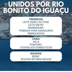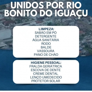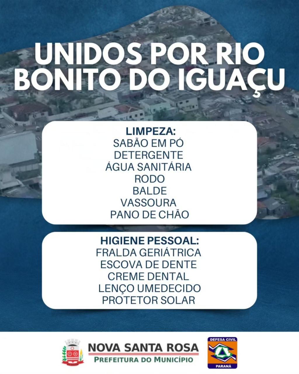 A Prefeitura de Nova Santa Rosa, juntamente com a Defesa Civil, informa que está em andamento uma campanha solidária em apoio às famílias de Rio Bonito do Iguaçu, que enfrentam dificuldades após a passagem do tornado que atingiu o município. A mobilização busca reunir doações prioritárias de itens de higiene e limpeza, roupas íntimas novas, alimentos não perecíveis e água potável.