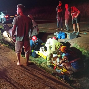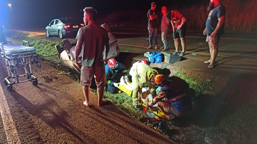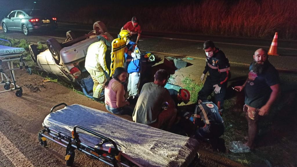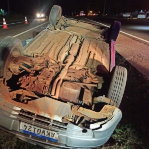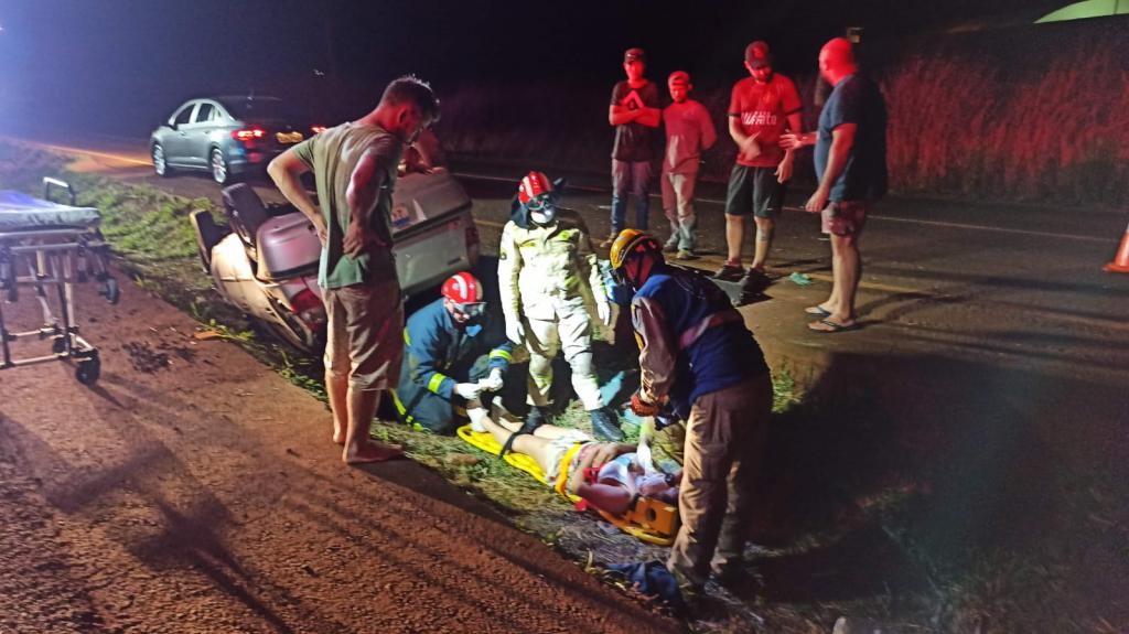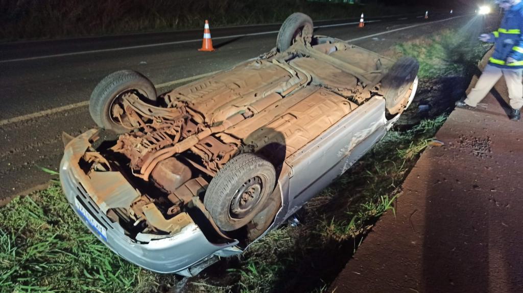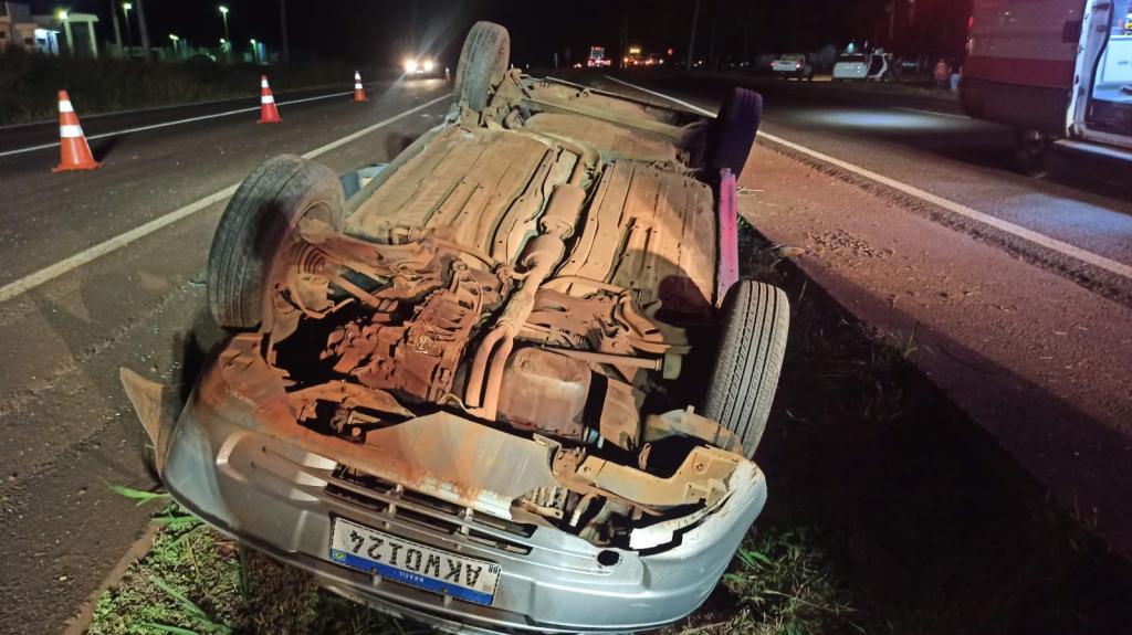 O veículo Fiat Palio com placas Mercosul seguia no sentido a rodovia com quatro ocupantes sendo o motorista duas mulheres e uma criança, o motorista teria perdido o controle e capotou o veículo parando com as rodas para cima dentro da valeta que divide as duas pistas.