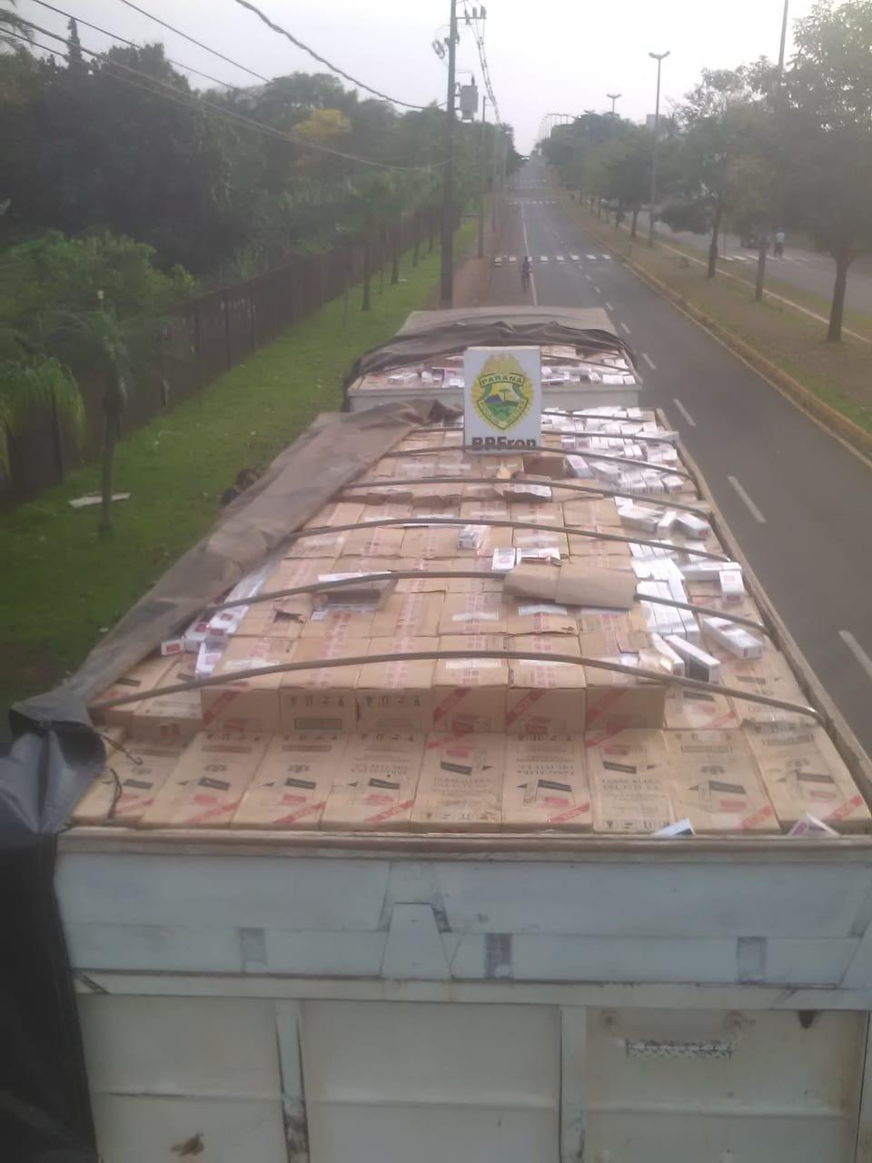 Foi empregado o Pelotão de Operações com Cães do BPFron na ocorrência que, após realizar revista no caminhão, foi constatado que os dois semirreboques acoplados ao caminhão estavam completamente carregados com cigarros contrabandeados do Paraguai, no total com cerca de 650 mil carteiras de cigarros, que, vendidas no mercado paralelo, a carga teria um valor final aproximado em um milhão e trezentos mil reais.
