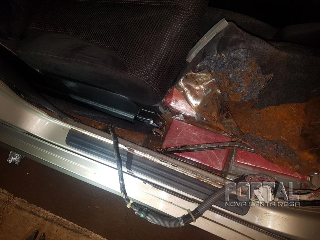 Por volta das 18h00 desta sexta-feira (16), a equipe da PRF de Santa Terezinha de Itaipu abordou em frente ao posto da PRF o veículo VW/Voyage, conduzido por um argentino de 43 anos. Mediante o nervosismo apresentado pelo condutor, os policiais rodoviários federais iniciaram busca minuciosa ao veículo e nada encontraram. Minutos depois, visualizaram e abordaram outro veículo argentino, um Nissan/Tiida, também conduzido por um argentino com 31 anos. Na vistoria ao Tiida localizaram grande quantidade de droga oculta em fundos falsos embaixo dos bancos dianteiros e traseiros. A droga foi identificada como pasta base de cocaína.