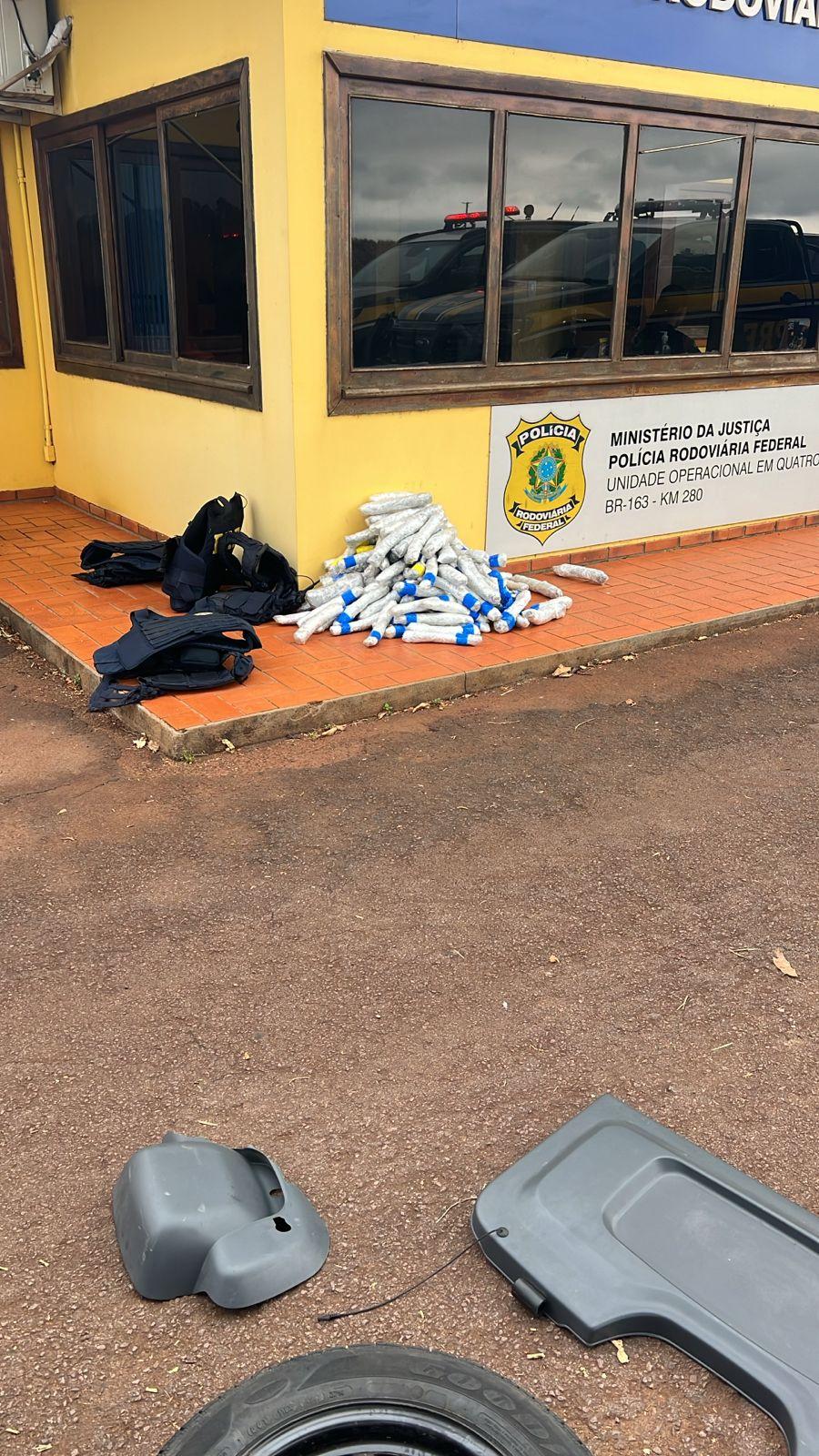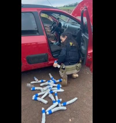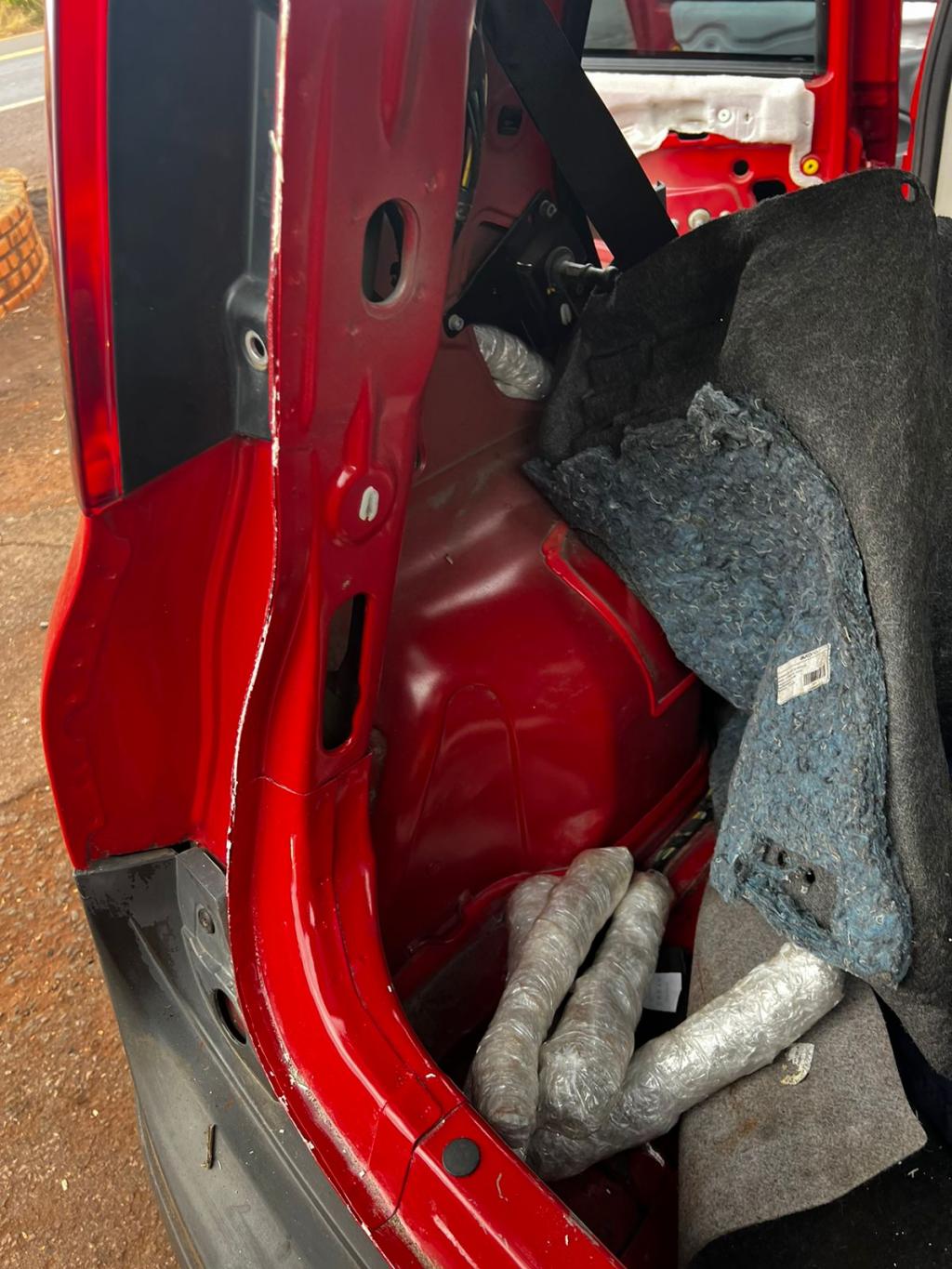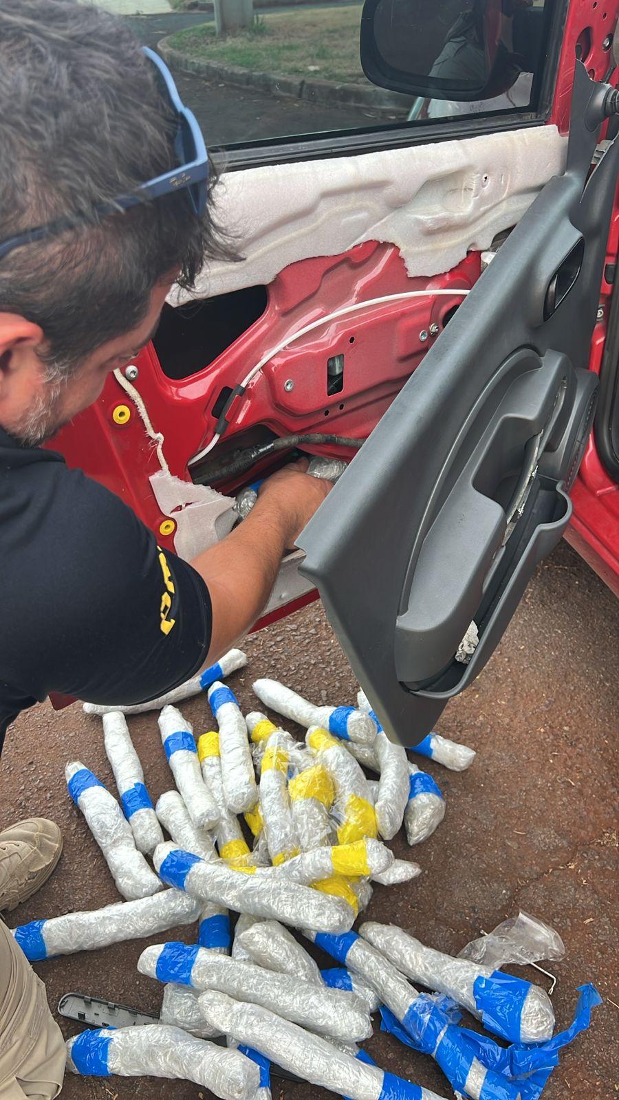 O veículo foi vistoriado e localizado vários tabletes com Skunk. O ocupante foi indagado sobre os pacotes, momento em que informou que sabia da existência da droga no carro, mas não sabia precisar exatamente do que se tratava.