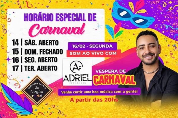 O clima de Carnaval já começou no Restaurante e Pizzaria do Negão, que preparou horário especial de funcionamento e programação musical para receber os clientes com muita animação.