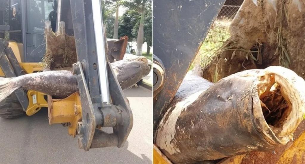 Uma carpa gigante foi retirada de uma represa com ajuda de uma reoescavadeira em Vargem Grande do Sul, São Paulo. O peixe pesava 65 quilos e tinha mais de um metro de comprimento.
