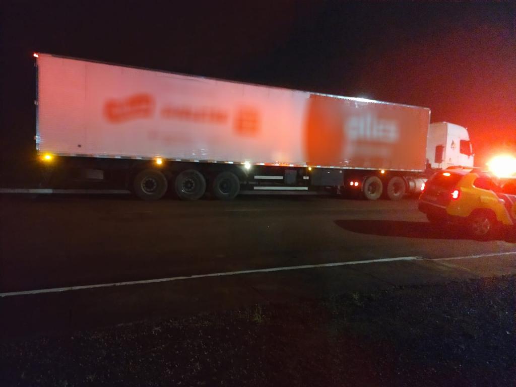 Uma carreta Volvo com baú carregada com frangos congelados foi apreendida na noite desta quarta-feira no interior de Maripá, na rodovia municipal MR 303.