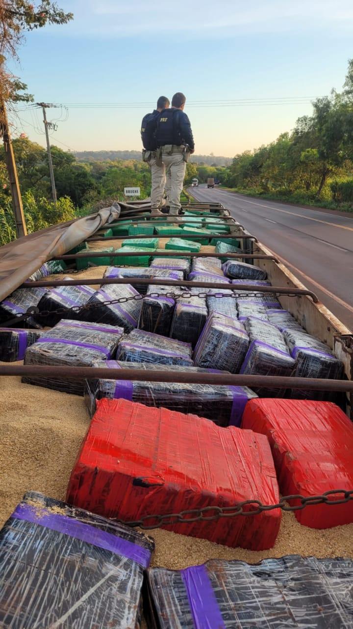 O condutor de 36 anos, morador de Nova Prata do Iguaçu, alegou aos policiais que carregou a soja no estado do Mato Grosso e a droga na cidade de Itaquiraí/MS e levaria até São Mateus do Sul/PR. A droga estava por cima da carga de soja.