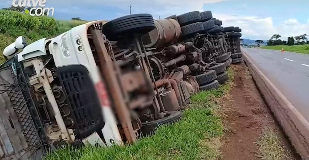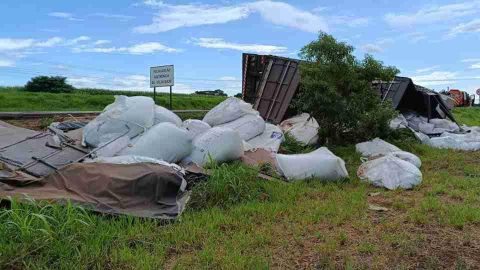 Segundo relato do motorista, ao se aproximar do viaduto, outro caminhão realizou uma manobra brusca, provocando uma “fechada”. Para evitar a colisão, ele desviou para o lado direito da pista. Nesse momento, as rodas da carreta saíram do asfalto e caíram em um desnível às margens da rodovia, o que acabou provocando o tombamento.