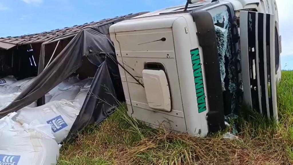 Na tarde desta terça-feira (24), uma carreta bitrem carregada com cerca de 50 toneladas de fertilizante tombou na BR-163, nas proximidades do viaduto com a Avenida Egídio Jerônimo Munaretto, em Toledo.