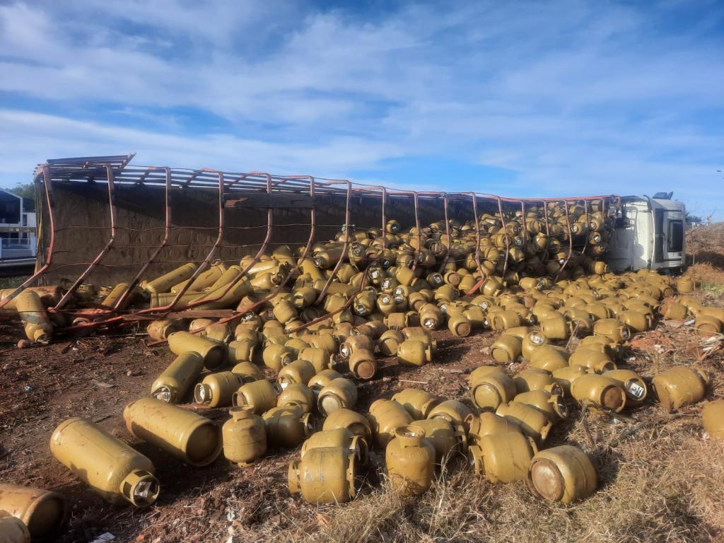 Uma carreta tombou com a carga de botijões de gás que estavam cheios na PRc 467, perto do cruzamento com a rua Jacarezinho, em Cascavel, no oeste do Paraná. O acidente aconteceu na tarde deste domingo (11). Nenhum dos três ocupantes do veículo ficaram feridos.