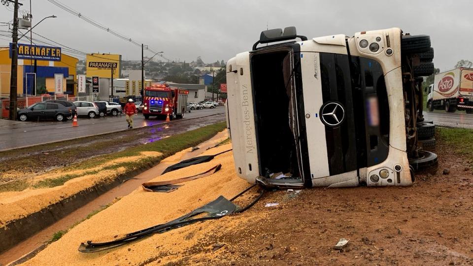 A carreta tombou com o lado do passageiro no chão, a estrutura do para-brisa se soltou da carreta. O condutor seguia pela rodovia sentido Foz do Iguaçu, a carga espalhou no canteiro que separa a rodovia da marginal. A equipe de reportagem do Catve.com apurou que a carreta foi carregada em Toledo e seria levada até o Rio Grande do Sul.