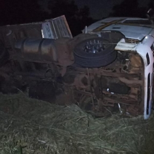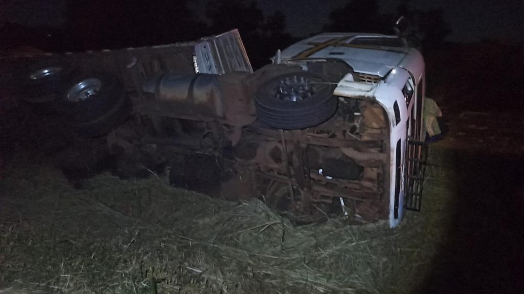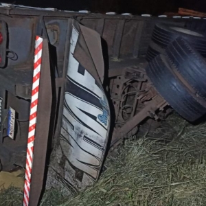 Uma carreta volvo bitrem carregada com farelo de soja tombou. De acordo com informações, o acidente aconteceu quando a carreta trafegava no sentido a Cascavel e logo após ter passado a ponte sobre o rio, o motorista perdeu o controle e saiu da pista e tombou dentro do canteiro central, espalhando a carga de farelo de soja na pista contrária.