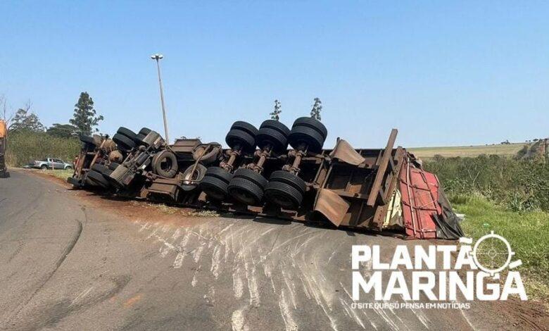 Uma carreta tombou, na tarde desta quarta-feira (28), ao contornar a rotatória na Rodovia PR-317, nas proximidades do antigo posto da Polícia Rodoviária Estadual (PRE) em Iguaraçu.