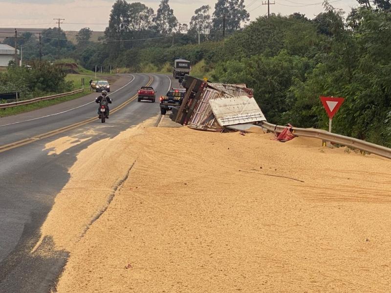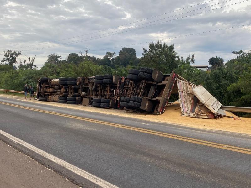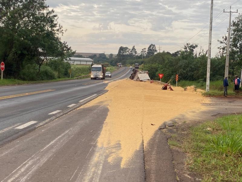 O veículo, que seguia para Santa Catarina, transportava farelo de soja. A carga ficou espalhada pelo local.