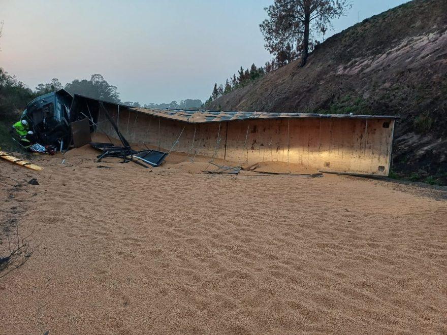 Uma carreta tombou por volta das 05 horas desta quinta-feira (12), na BR-373, no km 196, próximo à ponte do Rio Tibagi, região dos Campos Gerais. O caminhão transportava soja.