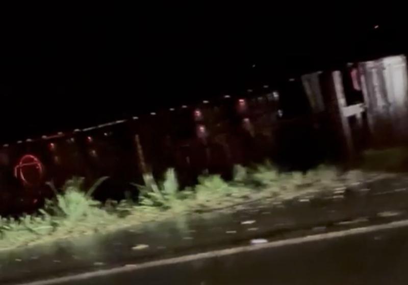 A carreta que tombou permanece no local aguardando a retirada. O trânsito na região exigiu atenção redobrada dos motoristas durante o atendimento da ocorrência.