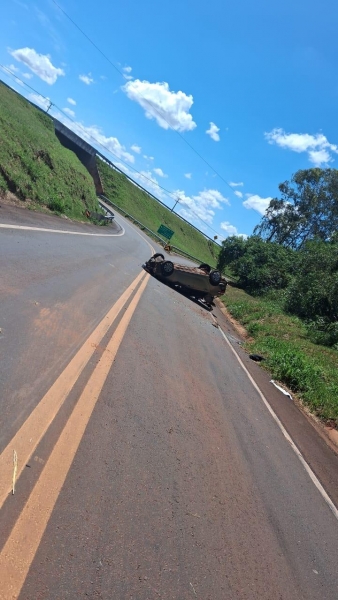 Um capotamento deixou uma motorista ferida nesta segunda-feira (16) na PR-486, no trecho entre Alto Piquiri e Perobal, no Noroeste do Paraná.