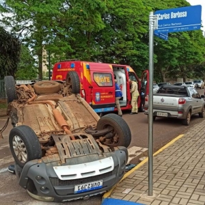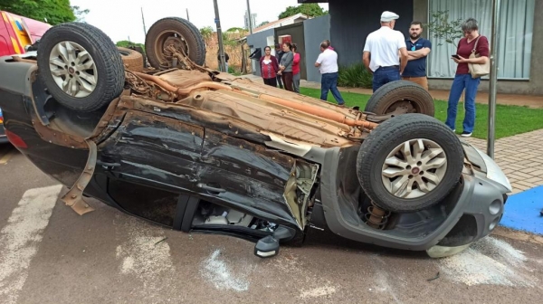 Um Fiat Palio conduzido por uma mulher de 44 anos capotou na quarta-feira a tarde feira no cruzamento da avenida Carlos Barbosa com rua Santo Campagnolo na vila Industrial em Toledo.