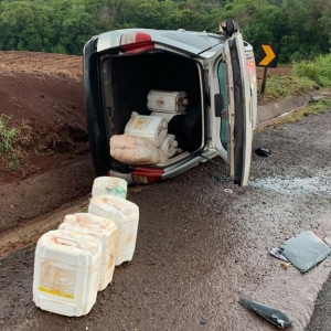 Carro carregado de agrotóxico foi abandonado depois de se envolver em acidente na tarde desta sexta-feira (25), no km 580 da PR 239 em Assis Chateaubriand.