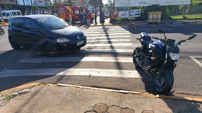 Um acidente de trânsito foi registrado por volta das 7h50 desta sexta-feira (26) no cruzamento da Avenida Parigot de Souza com a Rua Almirante Barroso, região central de Toledo. A batida envolveu um Volkswagen Fox e uma motocicleta Yamaha MT-07, ambos com placas do Mercosul.