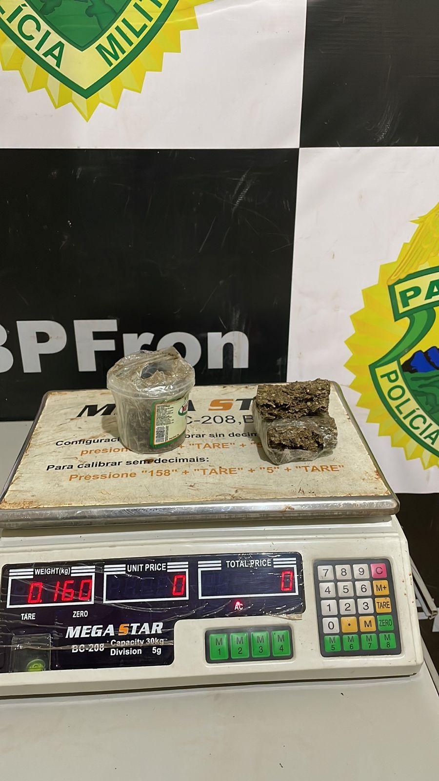 No compartimento de carga da moto foi localizado uma porção de maconha, pesando 160 gramas.