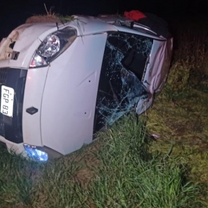 O motorista perdeu o controle do veículo após esbarrar em outro carro, saiu da pista e capotou parando as margens da rodovia na posição de lado.